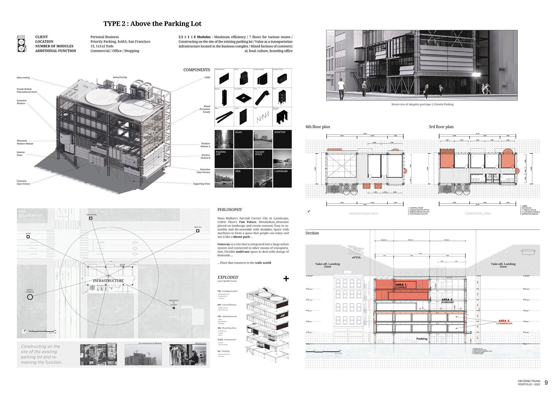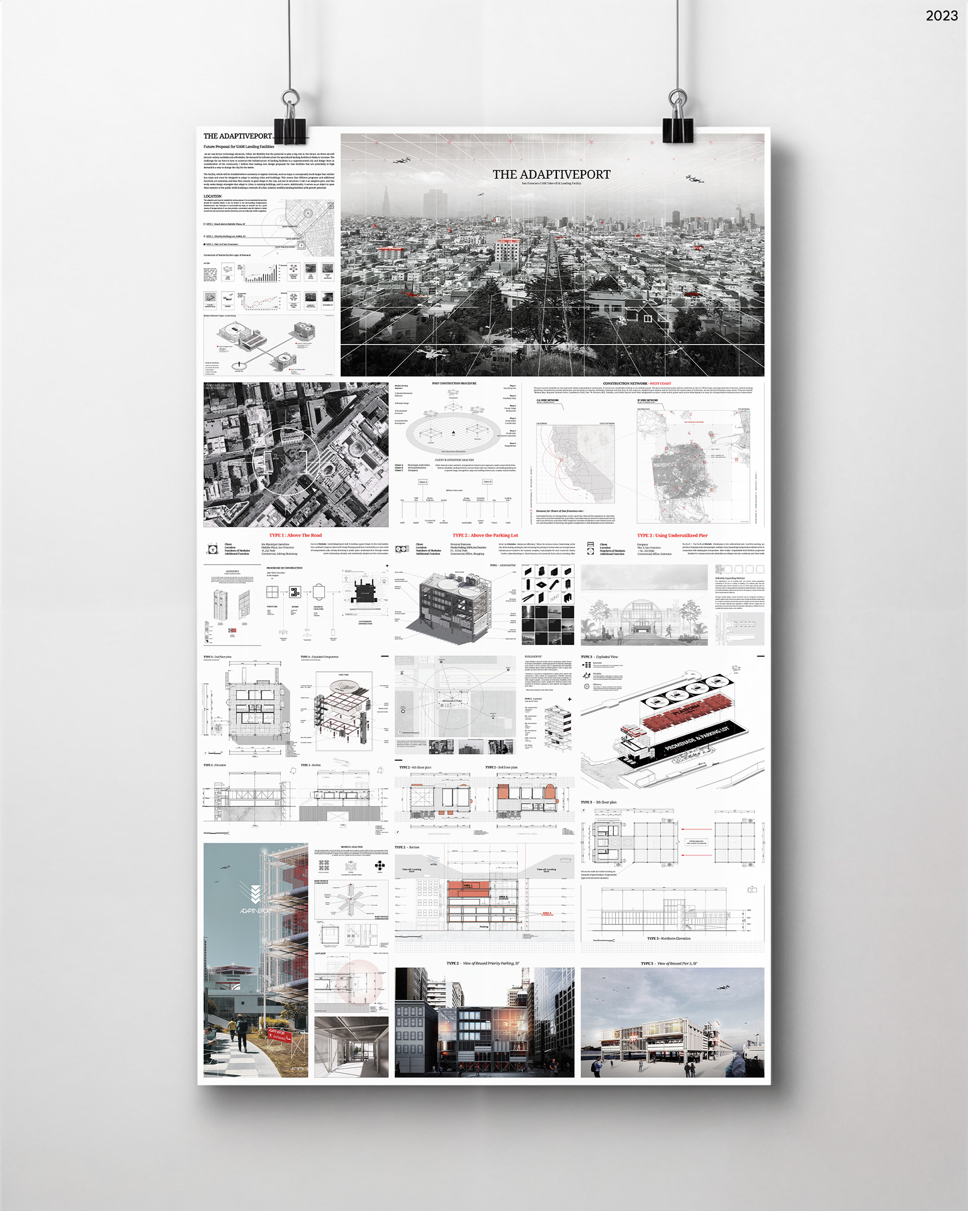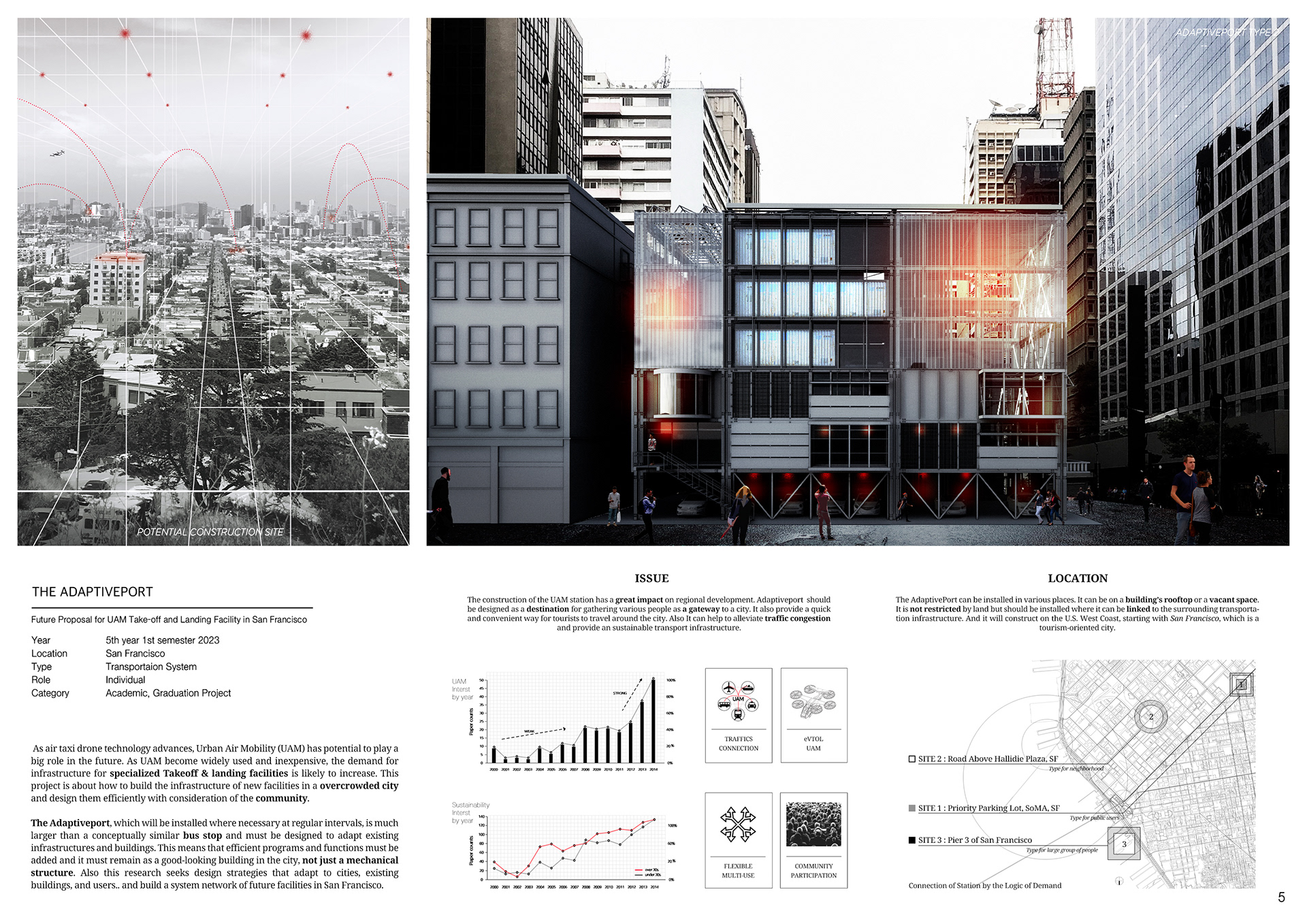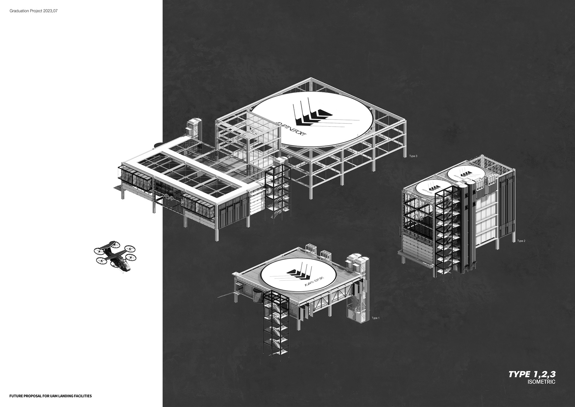 The Adaptiveport explores the future of urban air mobility infrastructure through modular, drone-based landing facilities.